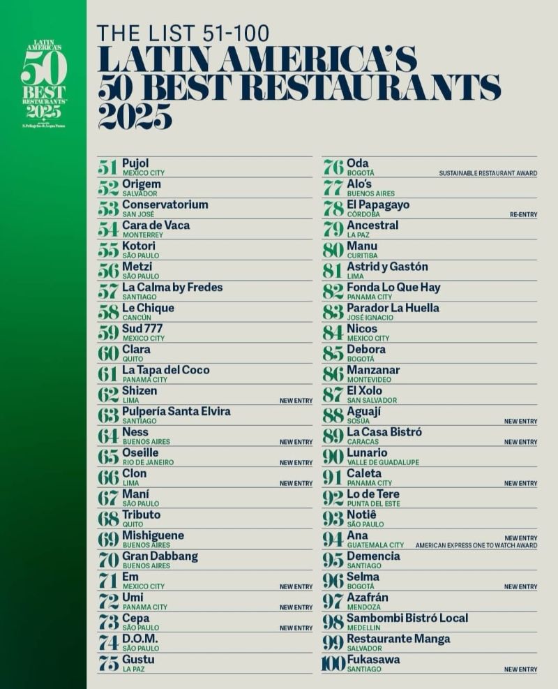 #18 Maito, #47 Cantina del Tigre, #61 La Tapa del Coco, #72 UMI, #82 Fonda Lo Que Hay, #91 Caleta